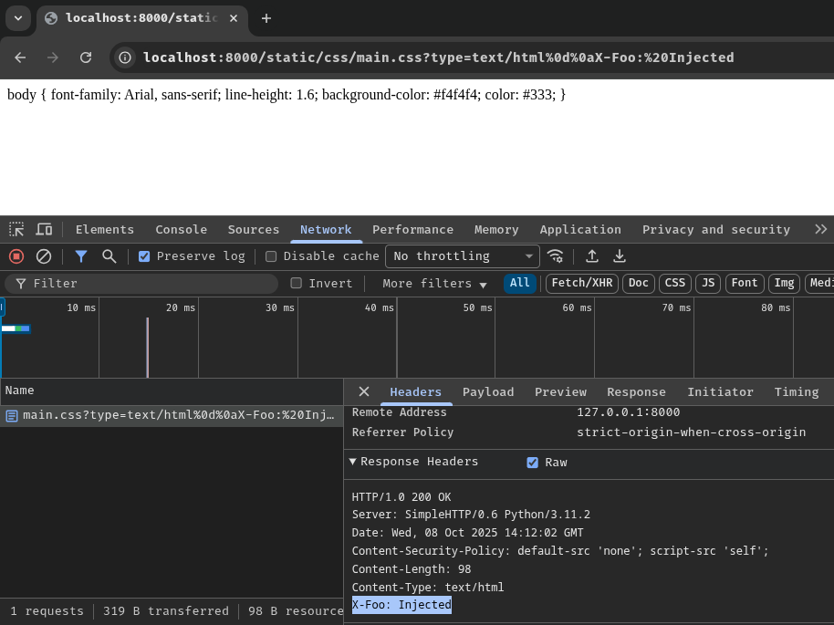 In the following example web application, it allows users to view static files and able to control the Content-Type of the file using GET parameter type. The value of parameter type is not validated or sanitized, which is vulnerable to CRLF injection: