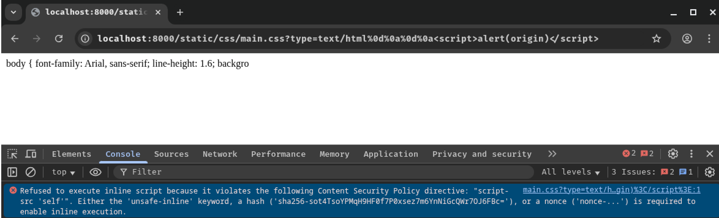 However, if we do response splitting and inject a <script> tag, the CSP will block its execution, because directive script-src's source is set to 'self', which means only sources that are from the same origin can be loaded. The directive also doesn't have source 'unsafe-inline'.